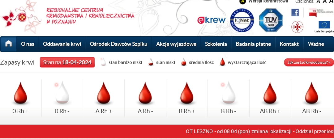 Jak witać na poniższym obrazku, w banku krwi w Regionalnym Centrum Krwiodawstwa i Krwiolecznictwa w Poznaniu brakuje aż dwóch rezerw podstawowych grup krwi O Rh (-) oraz B Rh (-). Dzięki dzisiejszej akcji w Gostyniu jest szansa na „zaczerwienienie” obu kropelek.