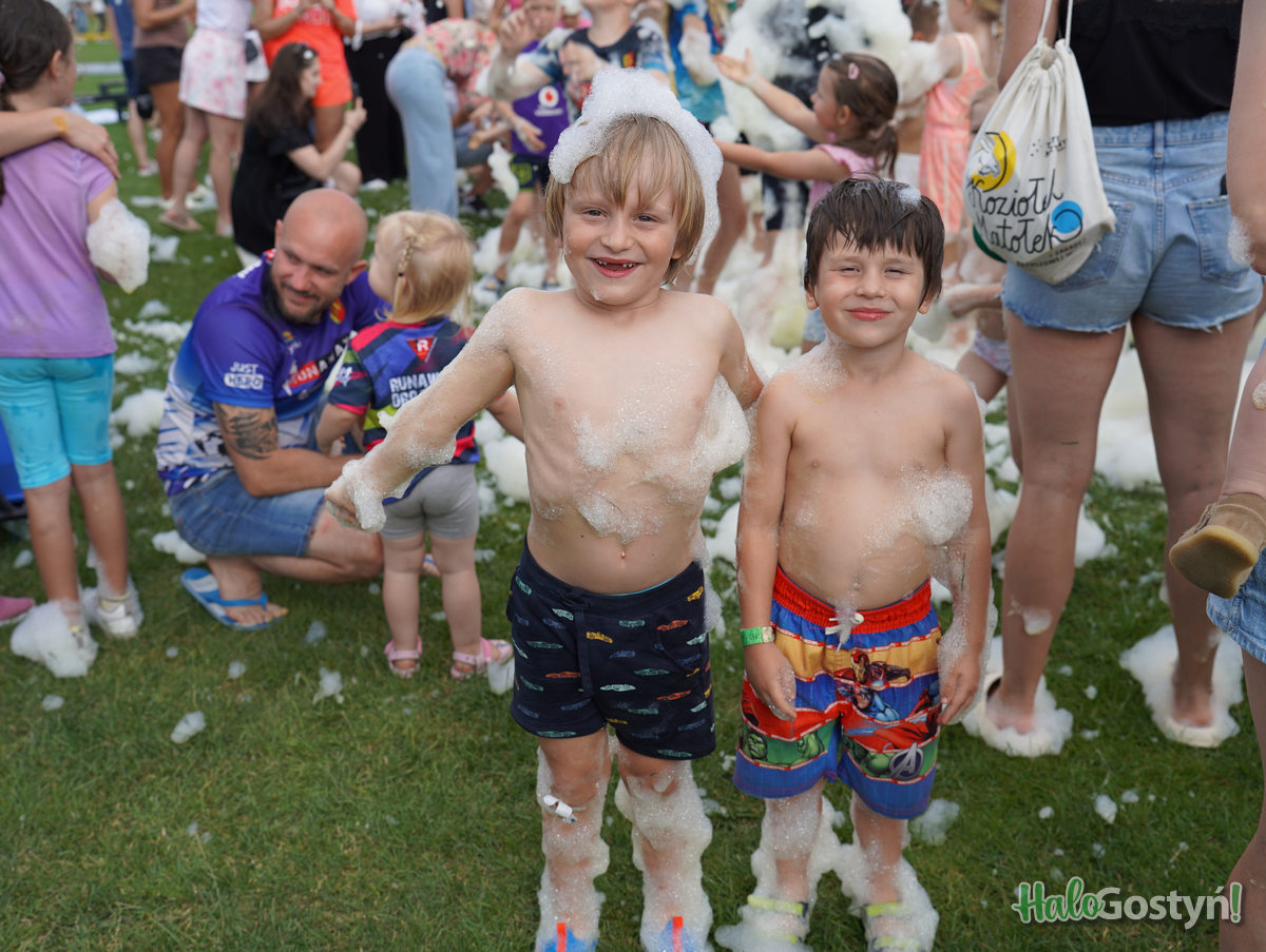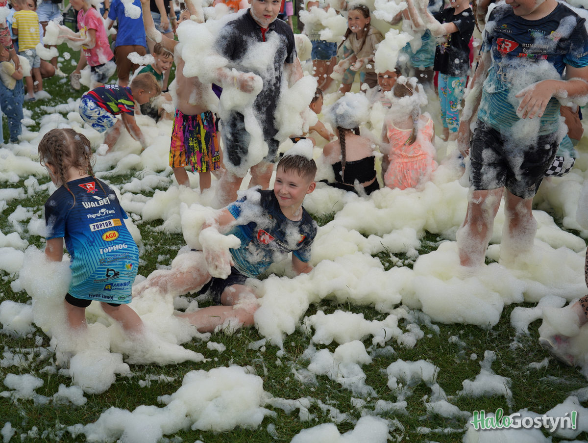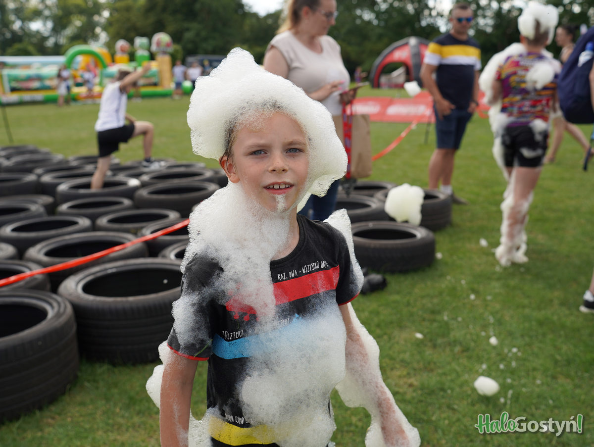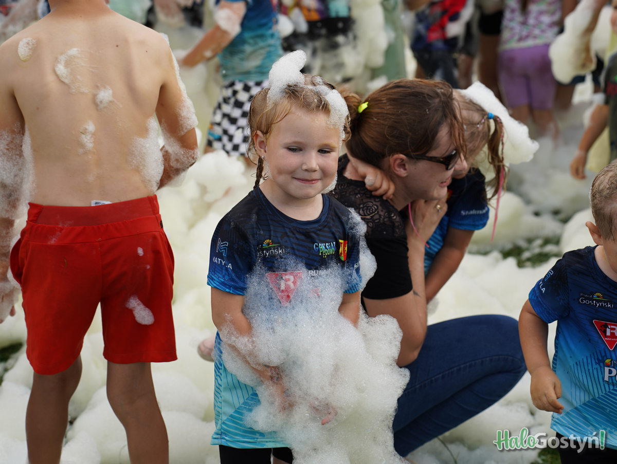 No tak, dzieci po pokonaniu kilkunastu przeszkód – w tym ślizgu do sztucznego bajorka- nie były zbyt czyste, ale i o to zadbali organizatorzy imprezy. Na zakończenie sportowej niedzieli umorusane dzieci (te już opłukane i przebrane tym bardziej) z entuzjazmem przywitały zabawę w kolorowej pianie. Co tam dzieciaki, widzieliśmy też kilkoro dorosłych, którzy pod pretekstem ratowania maluchów wbiegali w obłoki piany…