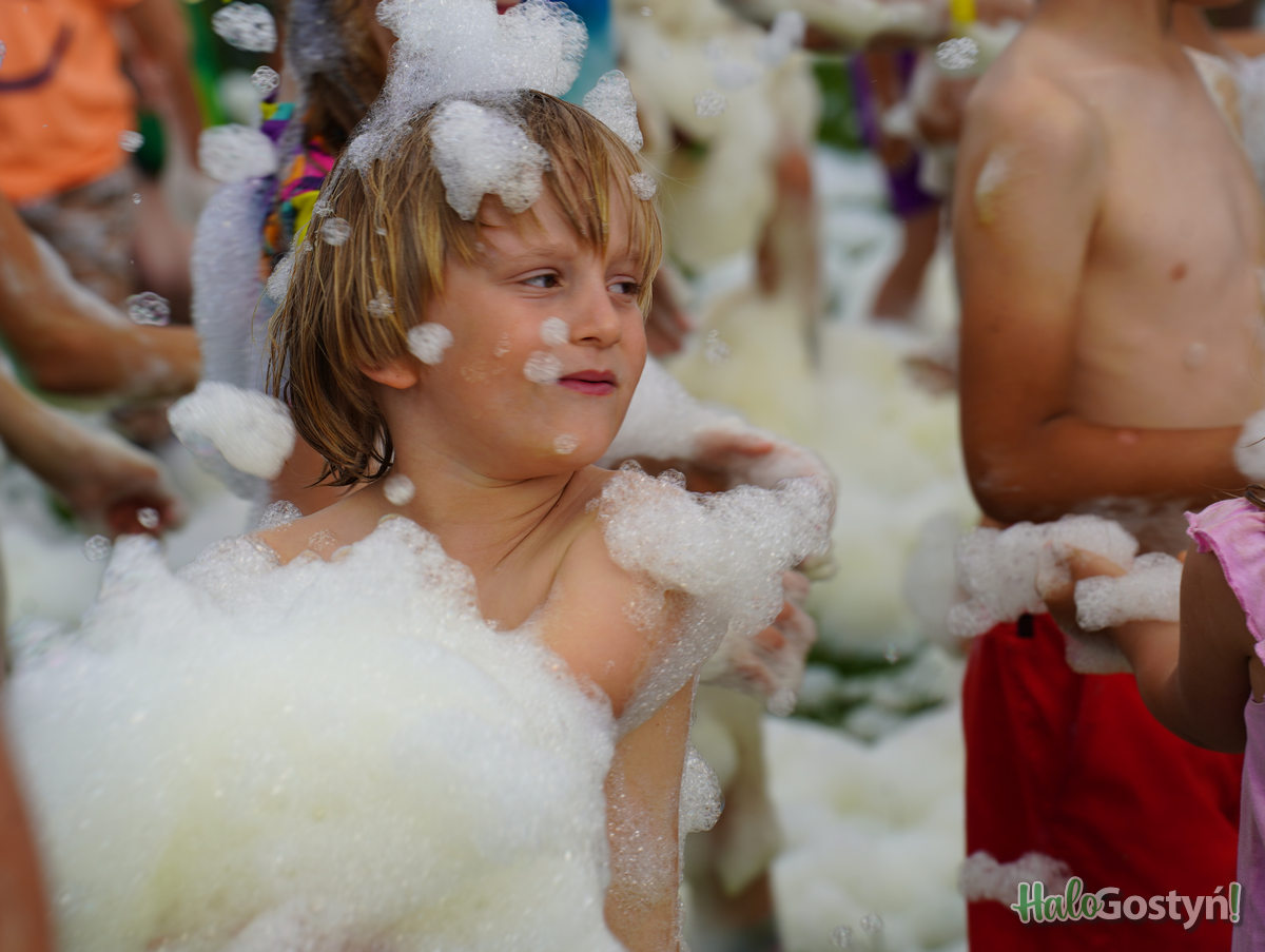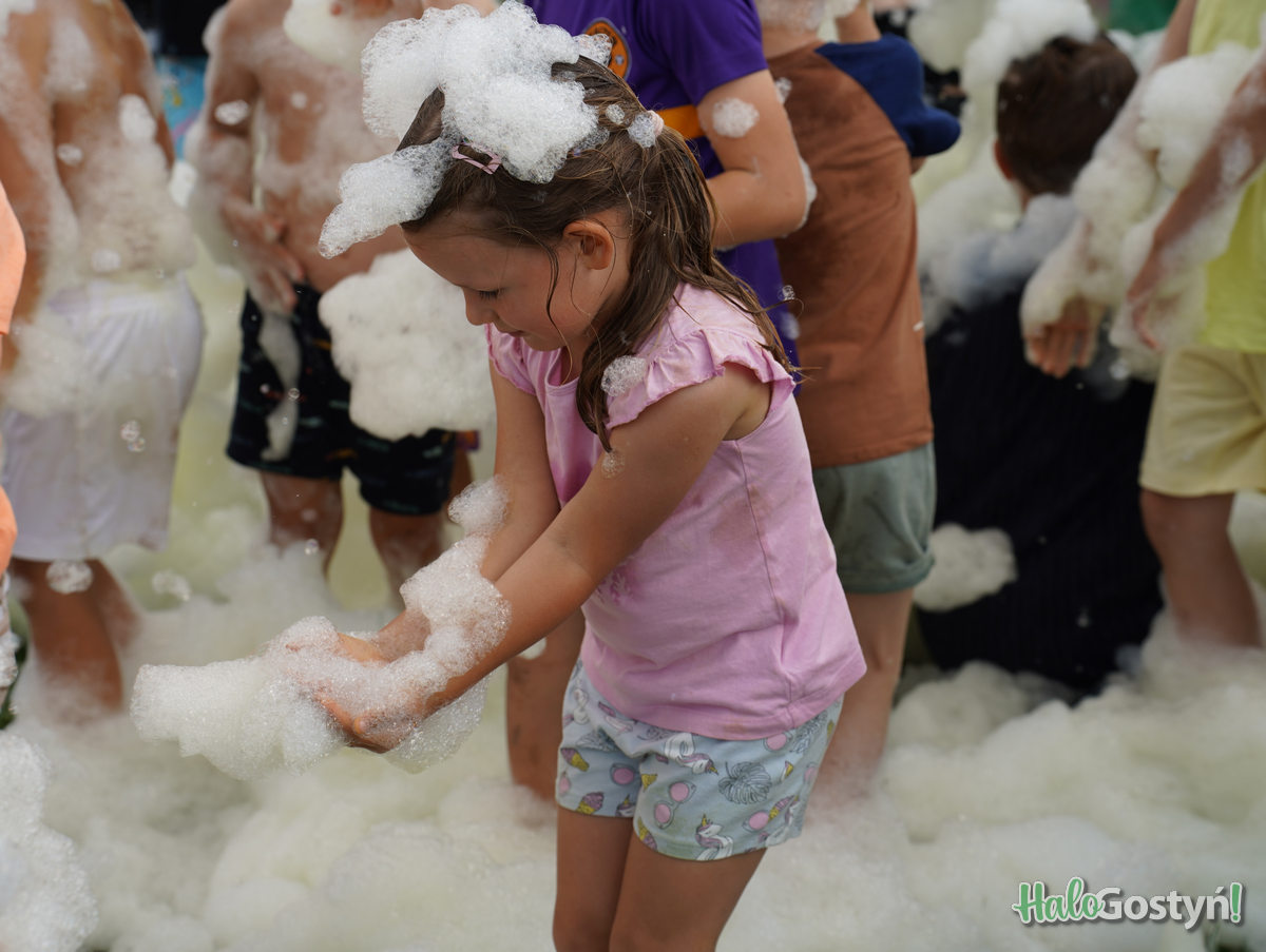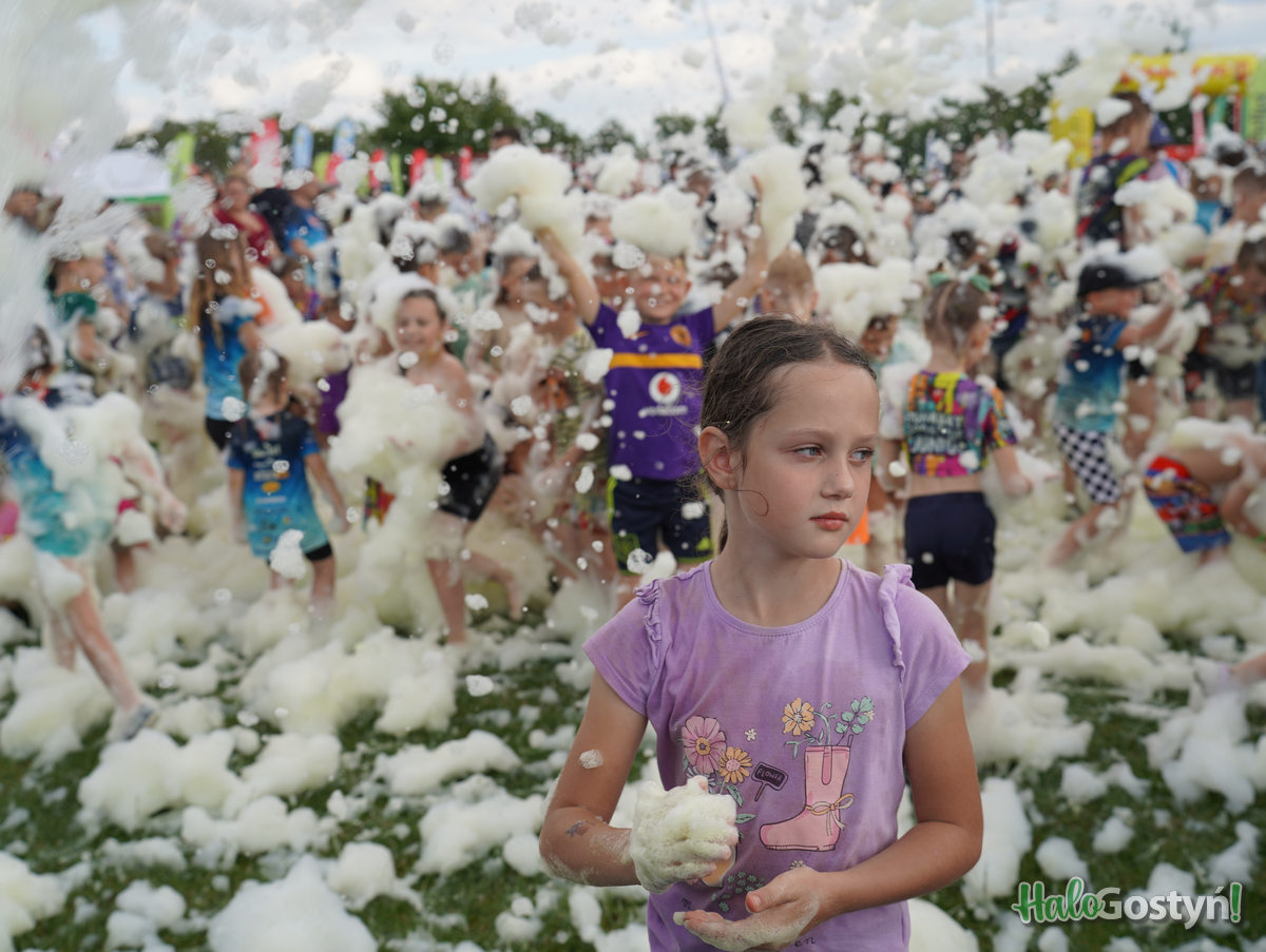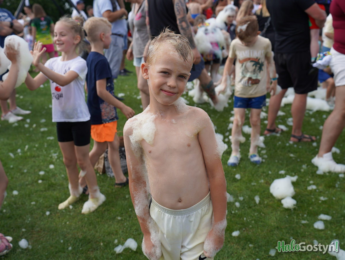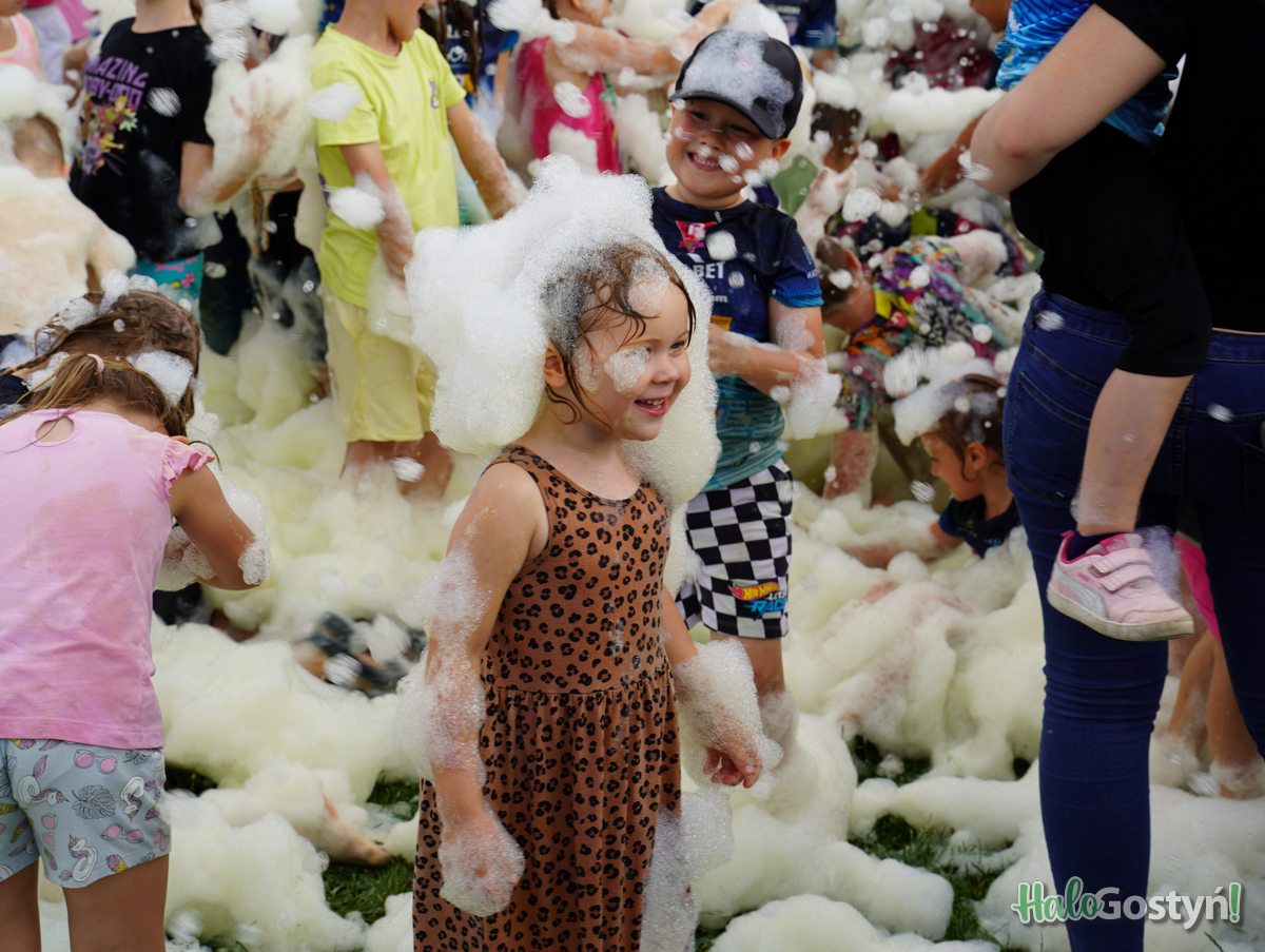No tak, dzieci po pokonaniu kilkunastu przeszkód – w tym ślizgu do sztucznego bajorka- nie były zbyt czyste, ale i o to zadbali organizatorzy imprezy. Na zakończenie sportowej niedzieli umorusane dzieci (te już opłukane i przebrane tym bardziej) z entuzjazmem przywitały zabawę w kolorowej pianie. Co tam dzieciaki, widzieliśmy też kilkoro dorosłych, którzy pod pretekstem ratowania maluchów wbiegali w obłoki piany…