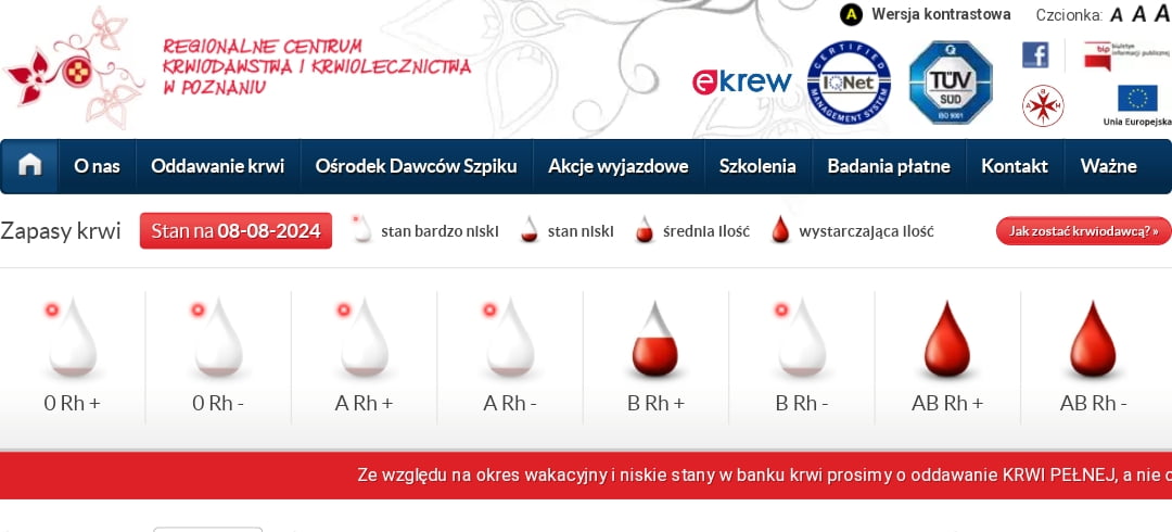 W Regionalnym Centrum Krwiodawstwa i Krwiolecznictwa na dzień zbiórki, czyli 8.08.2024 r. sytuacja jest alarmująca. Tak naprawdę nie brakuje jedynie zapasów krwi grup AB Rh(+) i AB Rh (-).