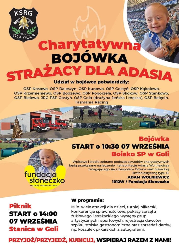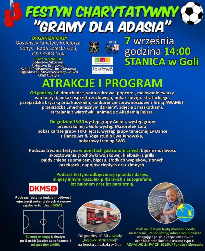 Mamy już wrzesień, imprezy dożynkowe za nami. Natomiast na festyny charytatywne zawsze jest dobra pora. I tak w sobotę, 7 września 2024 r. zapraszamy do Goli, by – w ten czy inny sposób – wspomóc w walce z białaczką 3-letniego Adasia Wolniewicza. Wszystkie ręce na pokład!
