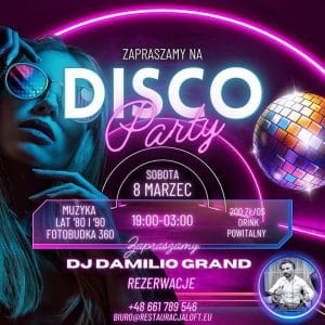 **8 marca** – to dzień, w którym przeniesiemy się w czasie! DJ Damiliogrand ponownie wejdzie za konsoletę, ale tym razem w stylu lat 80. i 90. Przygotujcie się na hity, które wszyscy znają i kochają! Będzie mnóstwo okazji do wspólnego śpiewania i tańczenia, a atmosfera na pewno będzie pełna radości i nostalgii.